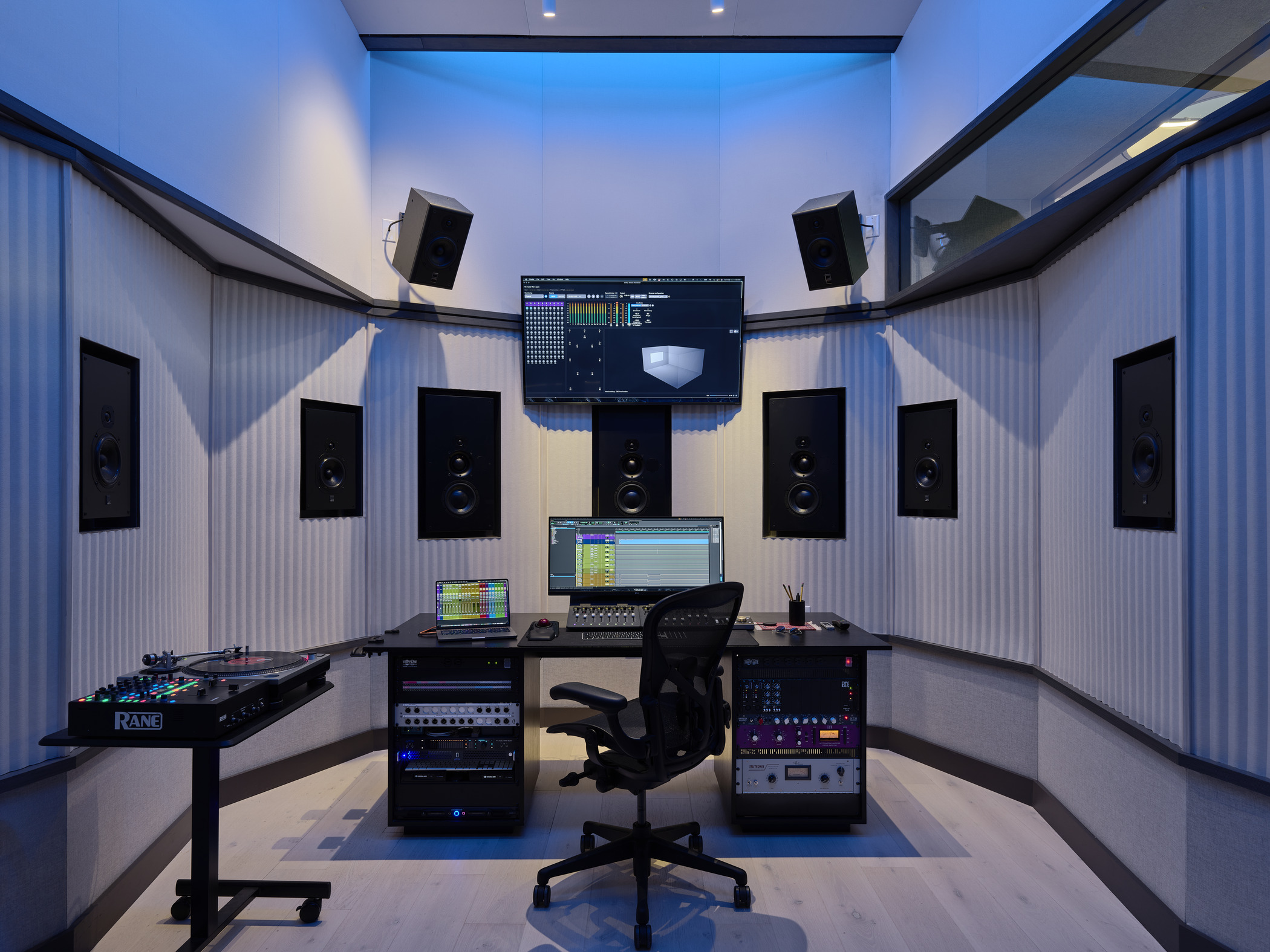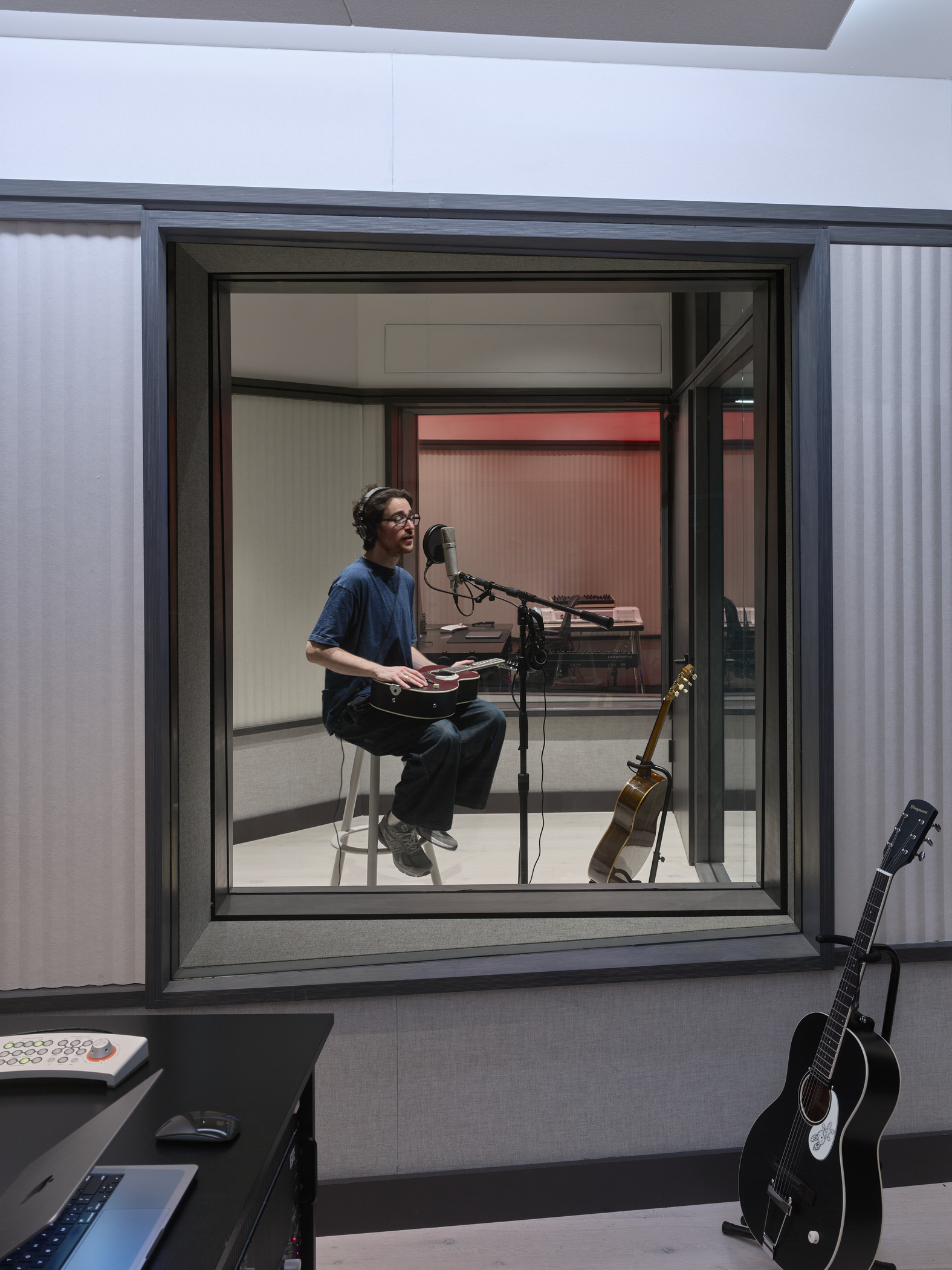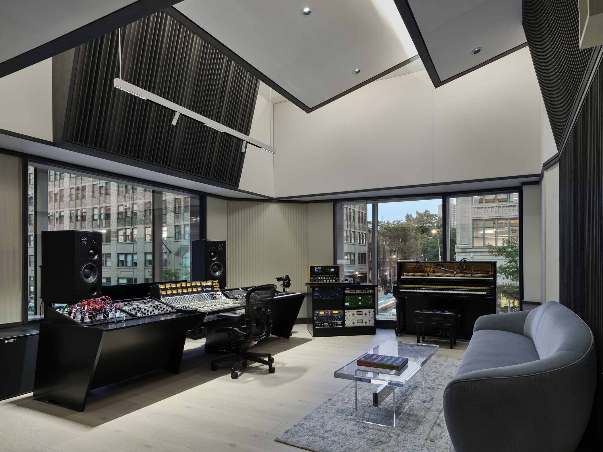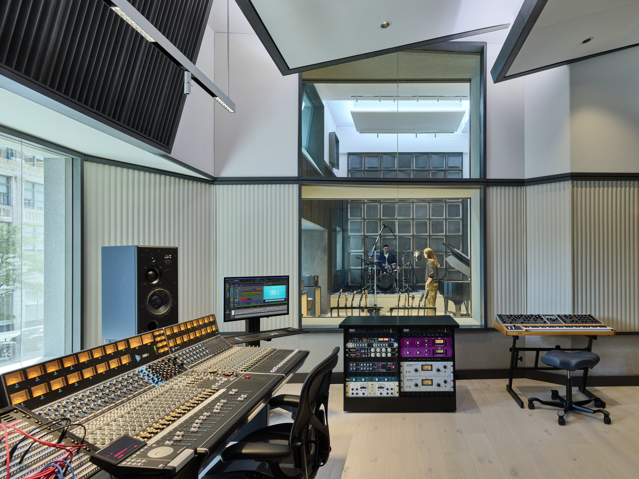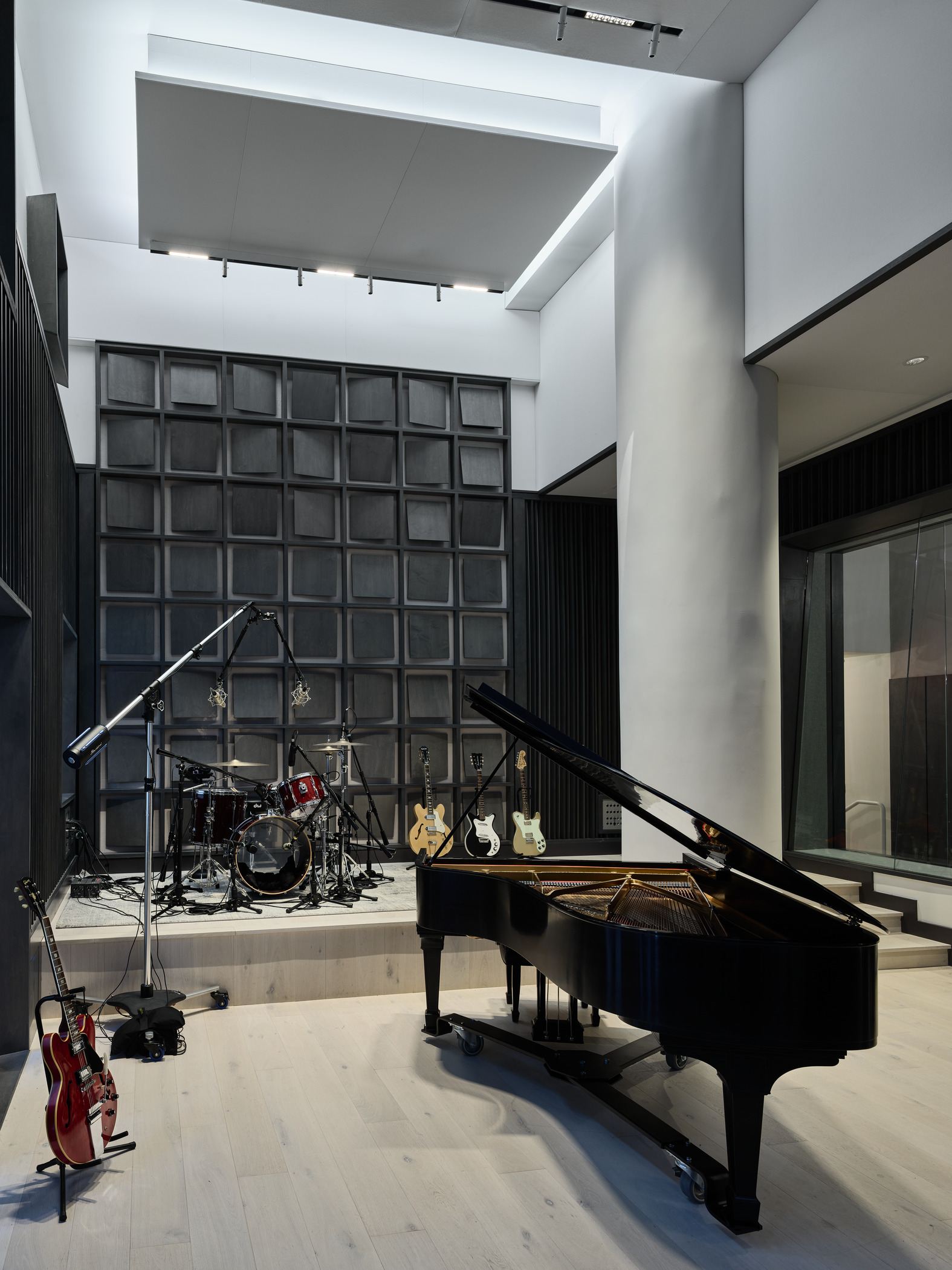The main studio opens onto a grand second-floor hall that is designed to be a creative concourse as opposed to a traditional lobby, lined with 20-foot-tall concrete columns. The ceiling is animated by daylight and a custom ceiling installation of abstracted guitar-pick forms with programmable LED lighting. Acoustics were treated as a design material, shaping chamfered walls, floating ceiling planes, and tuned diffusers into a sculptural soundscape.
