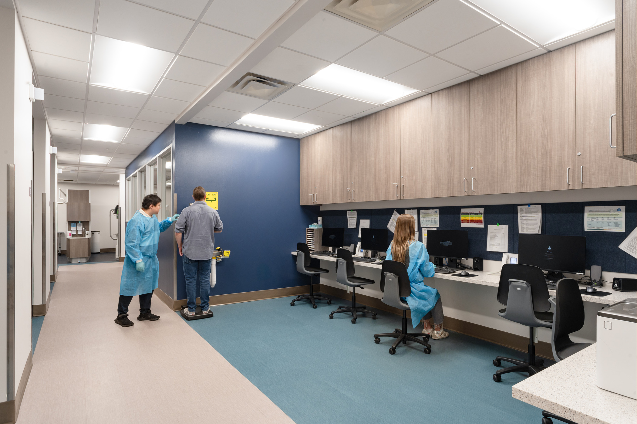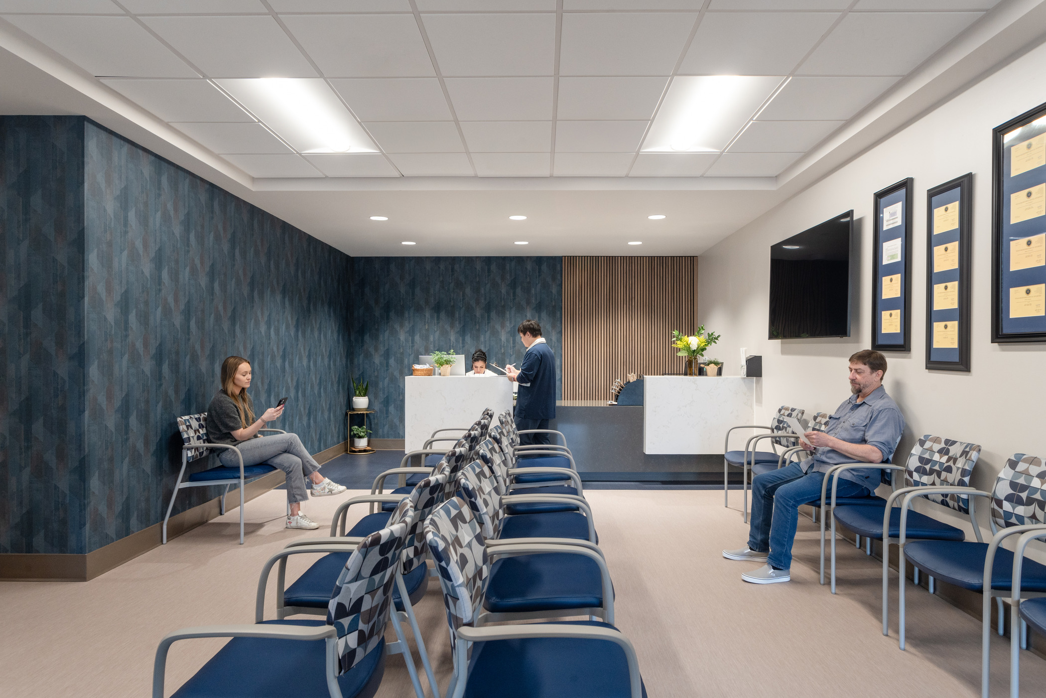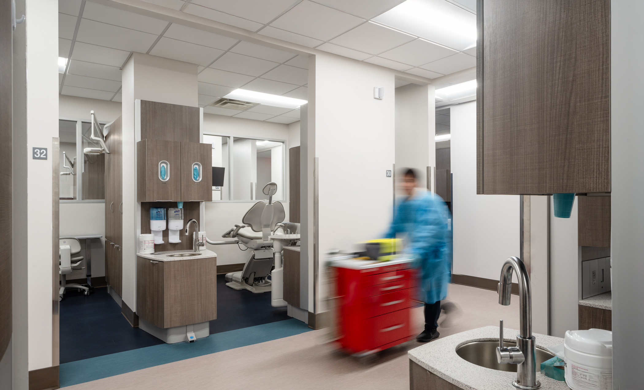 The renovation introduces 16 new operatories and corresponding instructional/support spaces, nearly doubling the highly competitive program’s annual cohort from 18 to 34 students. Imaging and laboratory capacity has also been overhauled as part of the renovation, introducing new equipment to greatly expand the teaching training services the clinic offers. Refreshed finishes throughout the clinic, including a re-imagined waiting room, prioritizes maintenance and durability while unifying the space under current ACC branding.