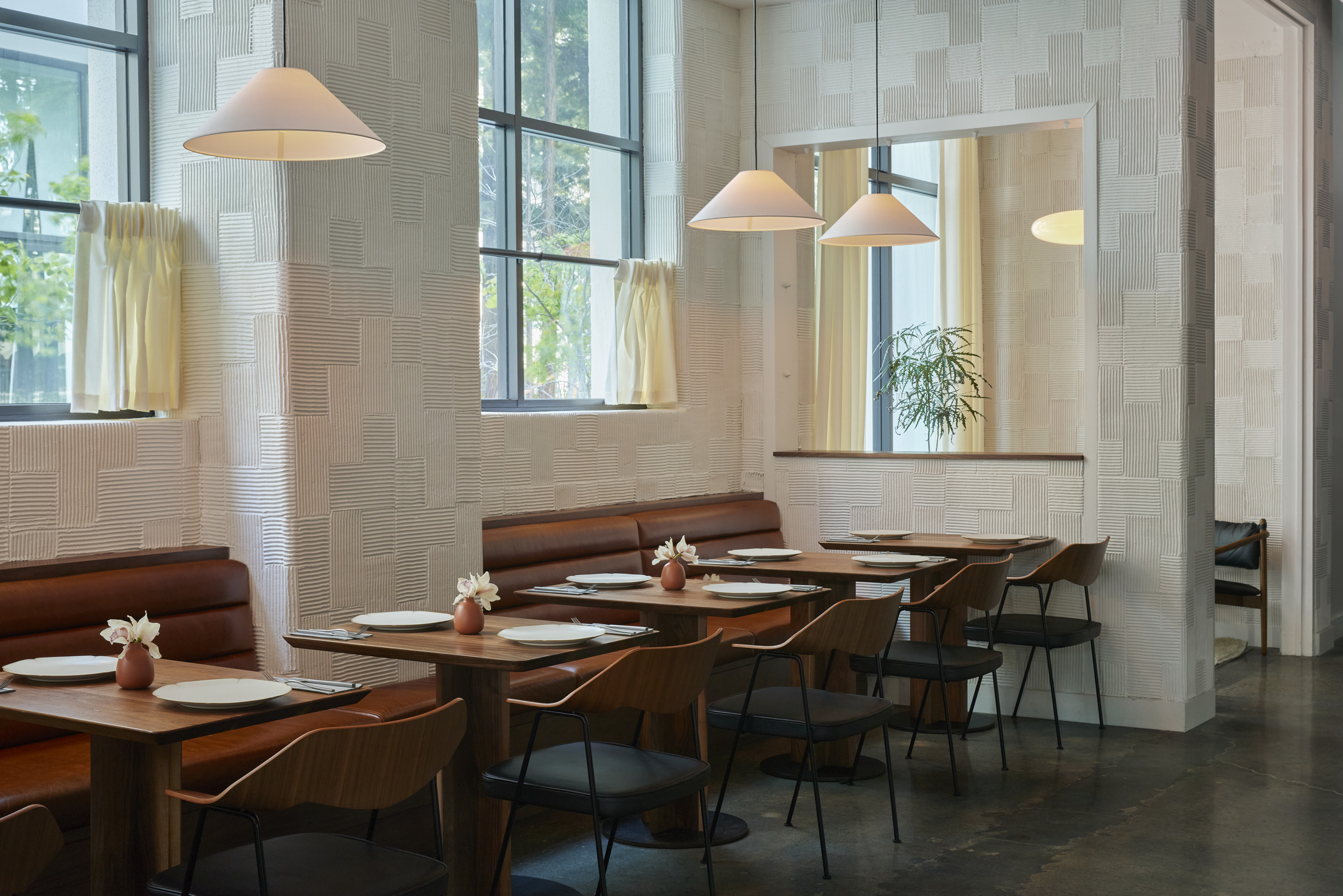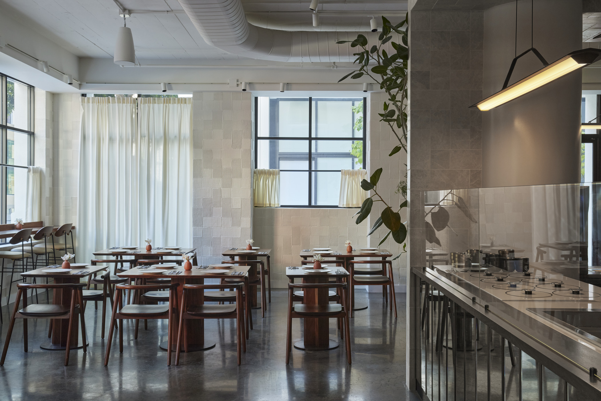 Cafe Sebastian is an upscale casual bistro serving breakfast and lunch. It is designed as a loggia garden space that rings the open finishing kitchen where all food for the three concepts will be prepared. It is a blend of an industrial warehouse vibe, earthy natural materials and eclectic furniture.